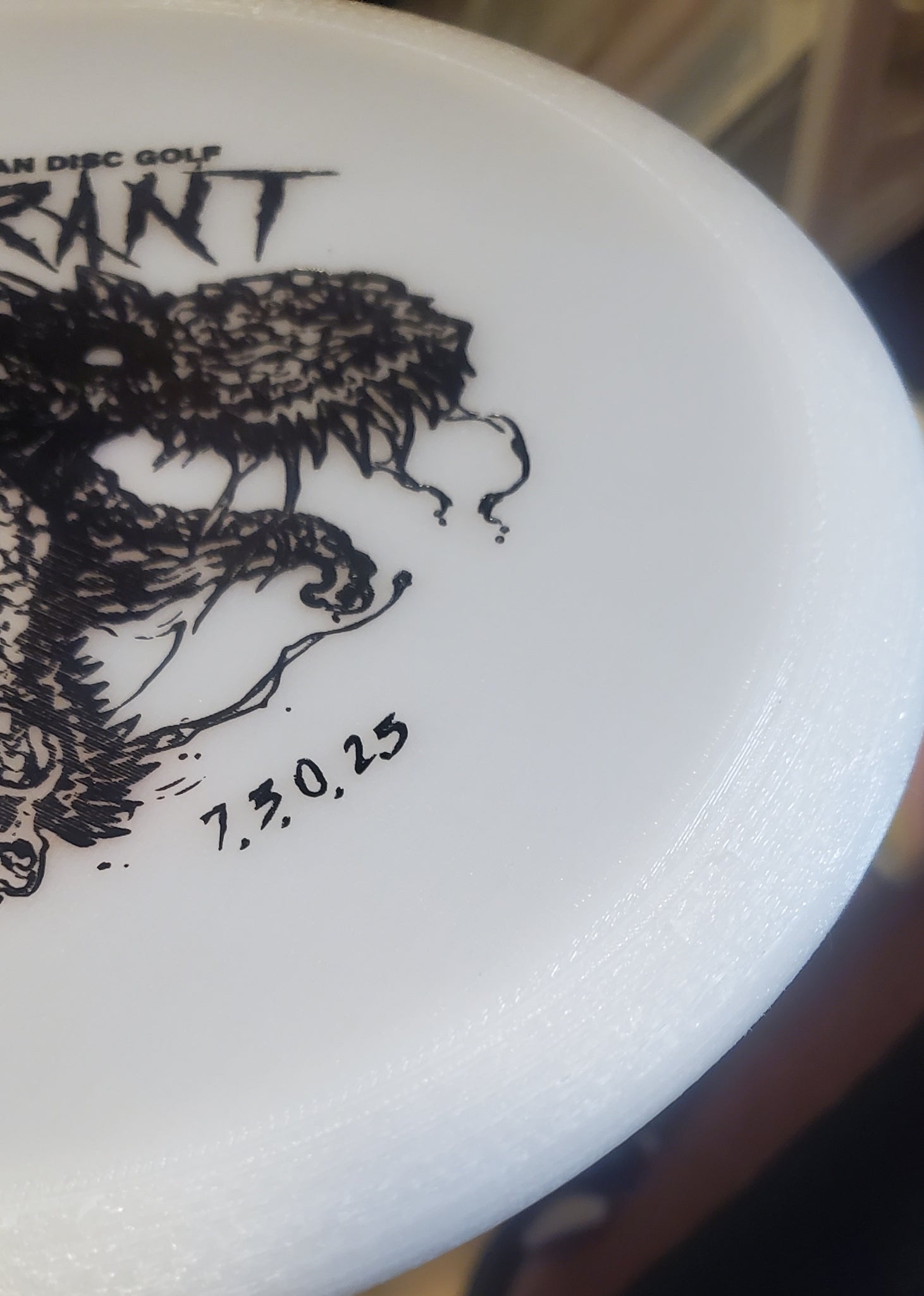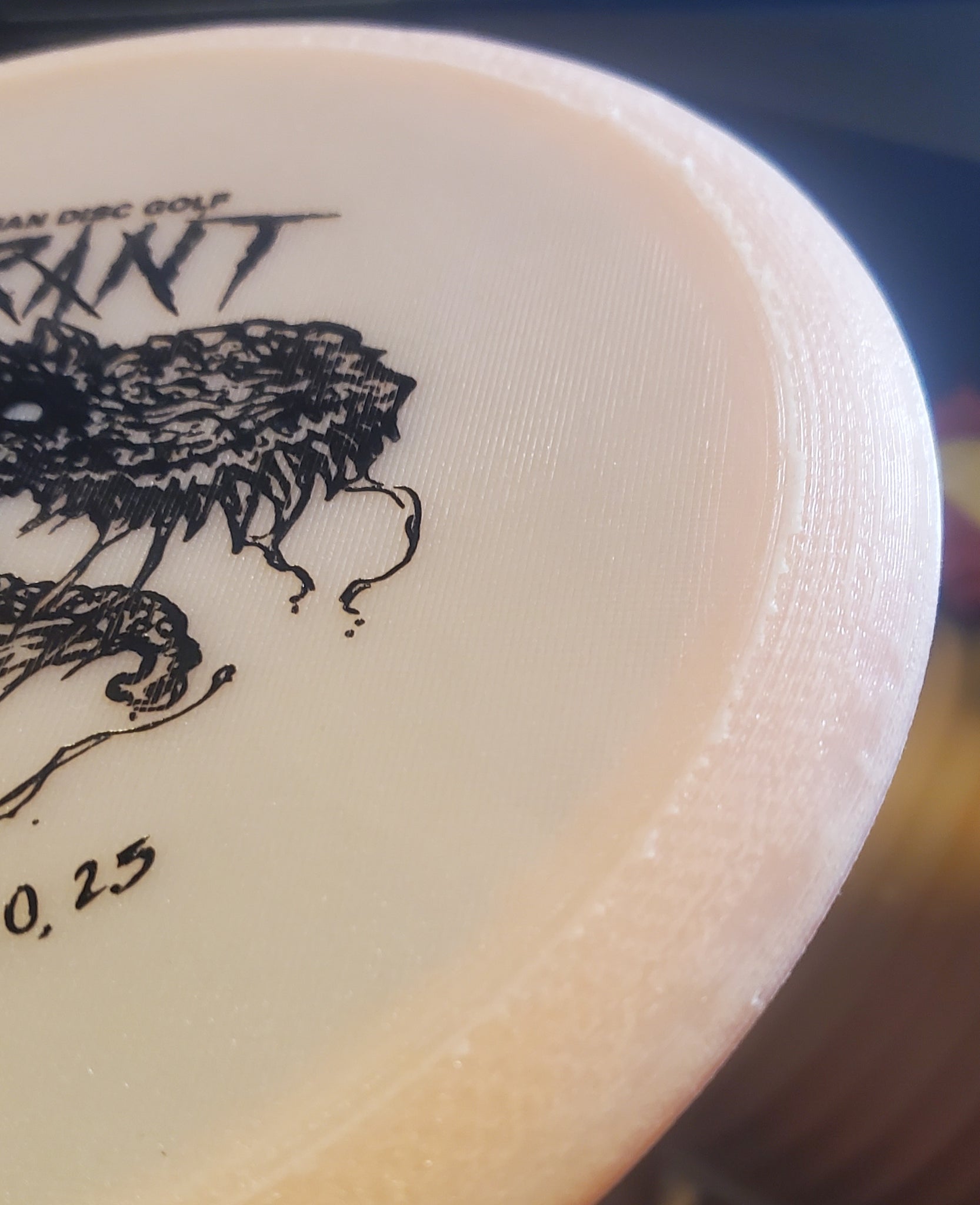 We are working hard to dial in our printing process to provide a consistent, professional feel, however, these discs are still prototypes and have a few cosmetic imperfections.